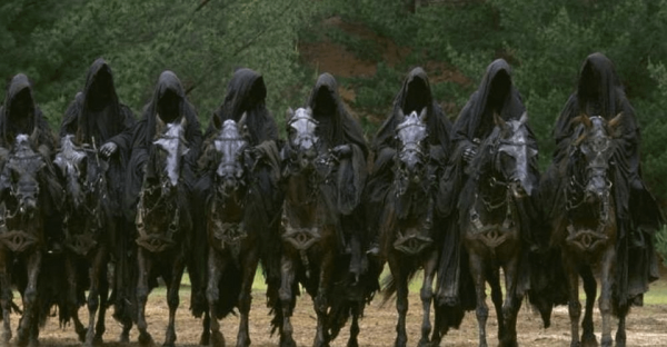 Nos referimos al encuentro entre Arwen (Liv Tyler) y los Nazgul. Es en esta escena donde venimos a mostrarte un detalle del atuendo de los caballos de los temidos espectros que quizá habías pasado por alto y que tiene un significado. A continuación, te mostramos el fotograma en cuestión.