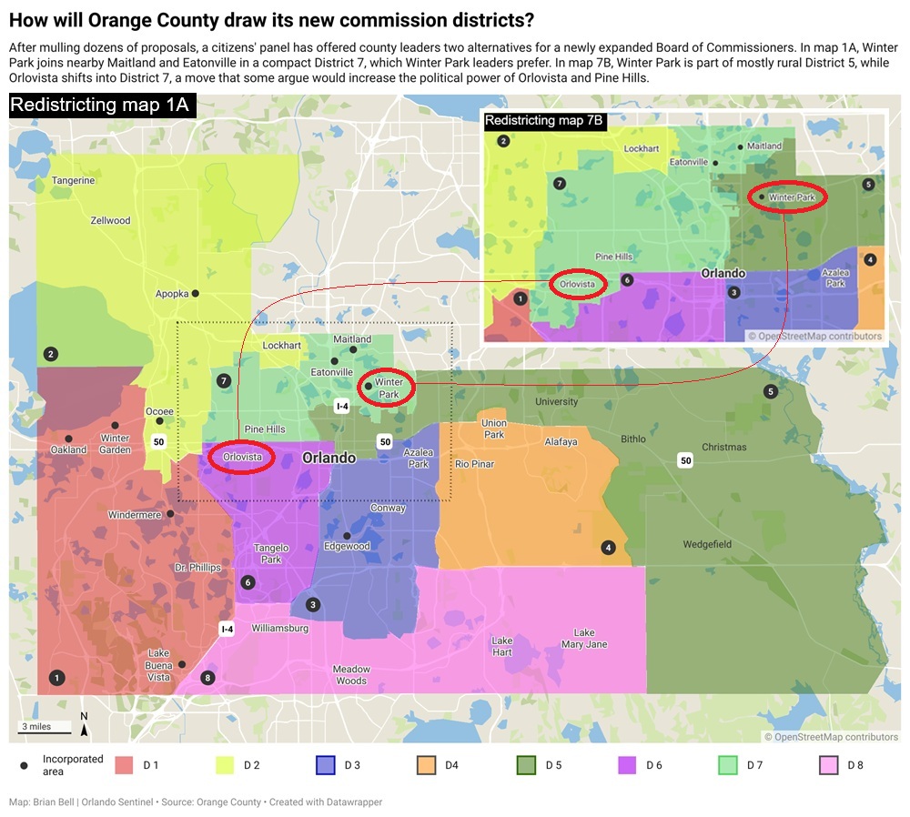 Los líderes electos en Winter Park prefieren un mapa conocido como 1A que coloca a la ciudad artística, su alta base de impuestos y 30,000 residentes en un nuevo Distrito 7 junto con ciudades vecinas, Eatonville y Maitland, y Pine Hills no incorporadas. Ese es un parque de invierno del distrito probablemente dominaría políticamente.