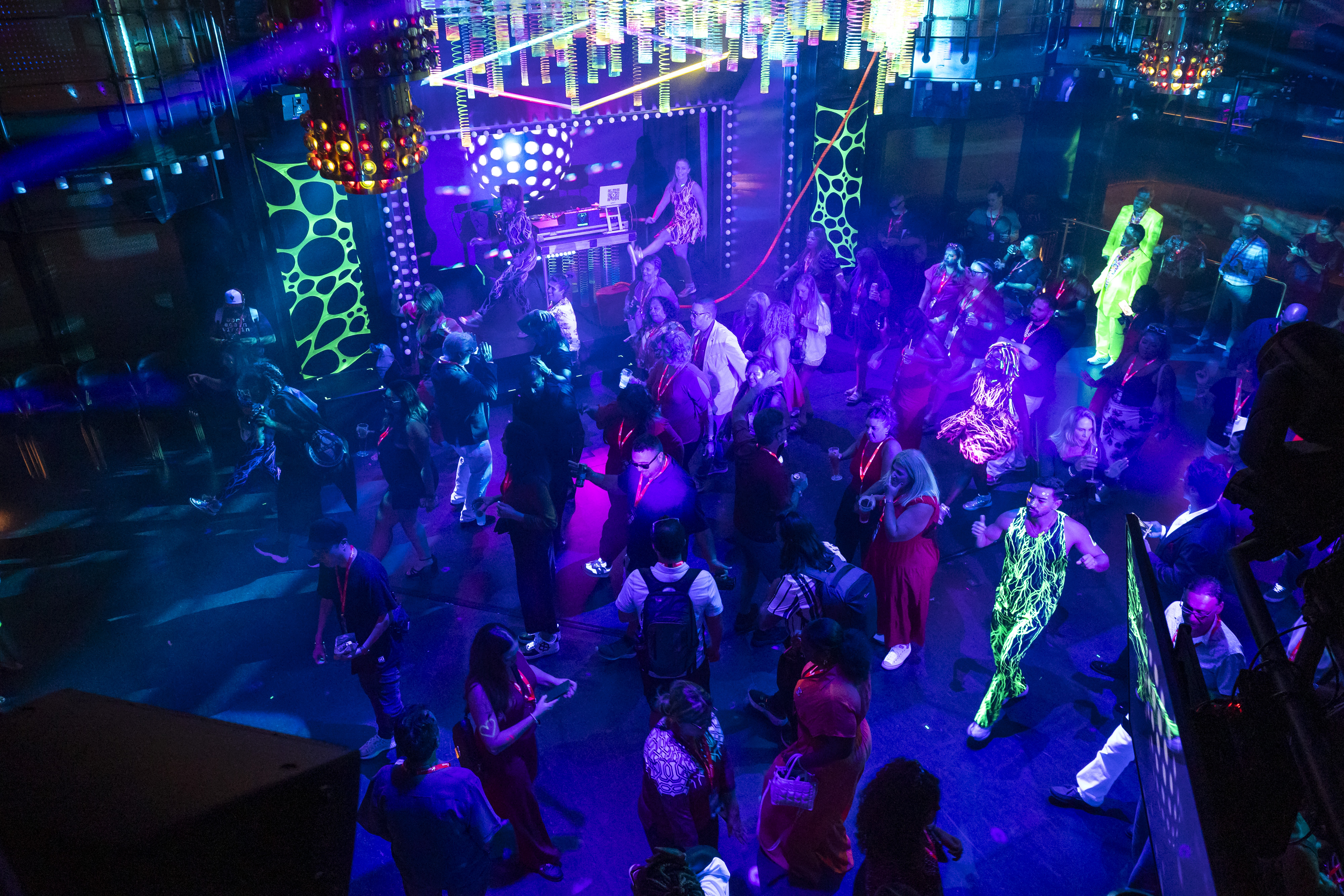 Al embarcar, una rotonda renovada da la bienvenida a los huéspedes a un atrio que se extiende por dos cubiertas con abundantes opciones para tomar asiento y tomar una bebida. En lugar de embarcarse para ver un gran vestíbulo o vestíbulo, una característica definitoria de la mayoría de los megabuques modernos, queda inmediatamente claro que el enfoque de la misión de Virgin son espacios íntimos para conectarse y socializar.