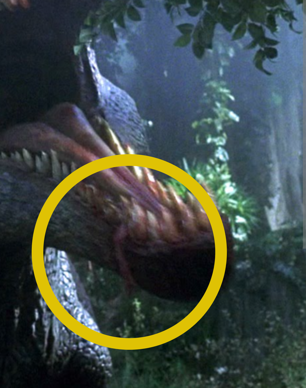 Aún siendo una película imperfecta, hay algún detalle fascinante en Parque Jurásico III que la hace más truculenta incluso que las dos anteriores. Por ejemplo, este momento increíble donde vemos, tras el accidente de avión, cuando el Spinosaurus se come a Nash… un trocito de él totalmente ensangrentado entre sus dientes. ¡Alguien debería dejarle un poco de hilo dental jurásico para sacarle de ahí!